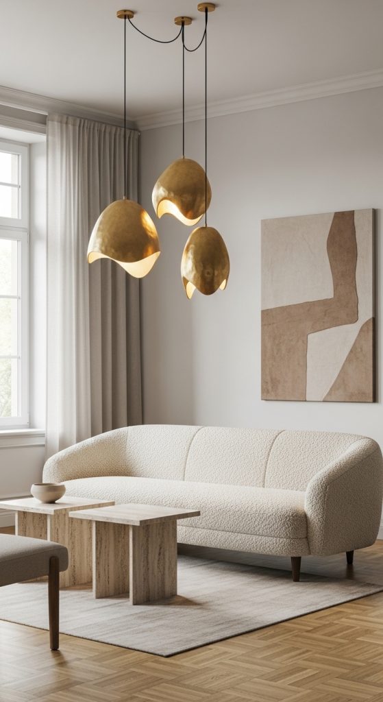 Instead of traditional chandeliers, choose sculptural pendant lights or modern floor lamps. Think geometric shapes, curved metal frames, or globe lighting.