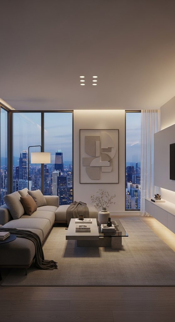 A luxury minimalist living room often begins with a soft neutral palette—think ivory, warm beige, taupe, greige, and muted stone tones. The magic lies not in color variety but in texture layering.