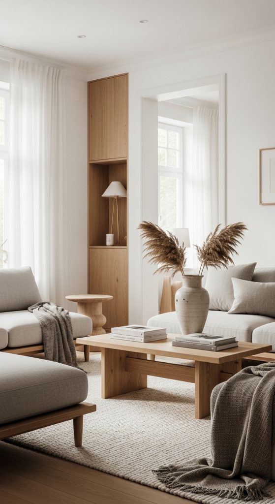 A low-profile sofa with clean lines enhances the minimalist feel. Opt for neutral upholstery like cream, sand, or light gray. The simplicity of the silhouette creates openness and sophistication.