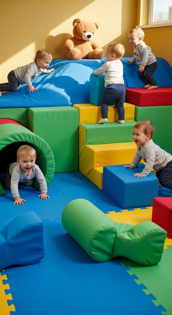 Use Dollar Tree foam mats, cones, or soft toys to create a safe mini obstacle course. Encourage crawling over mats, weaving between cones, or climbing gentle pillows.