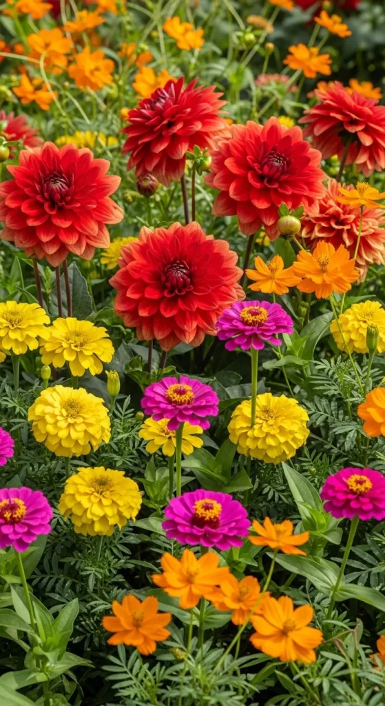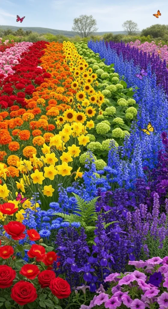 If you love diversity and joy, why not go full rainbow? Red, orange, yellow, green, blue, indigo, and violet flowers planted in sections or mixed together create a magical, eye-catching display. This palette is playful and uplifting, perfect for public gardens, parks, or home gardens where you want to encourage exploration and wonder. The key to a successful rainbow garden is balance—ensure colors blend naturally and avoid cluttering the space.