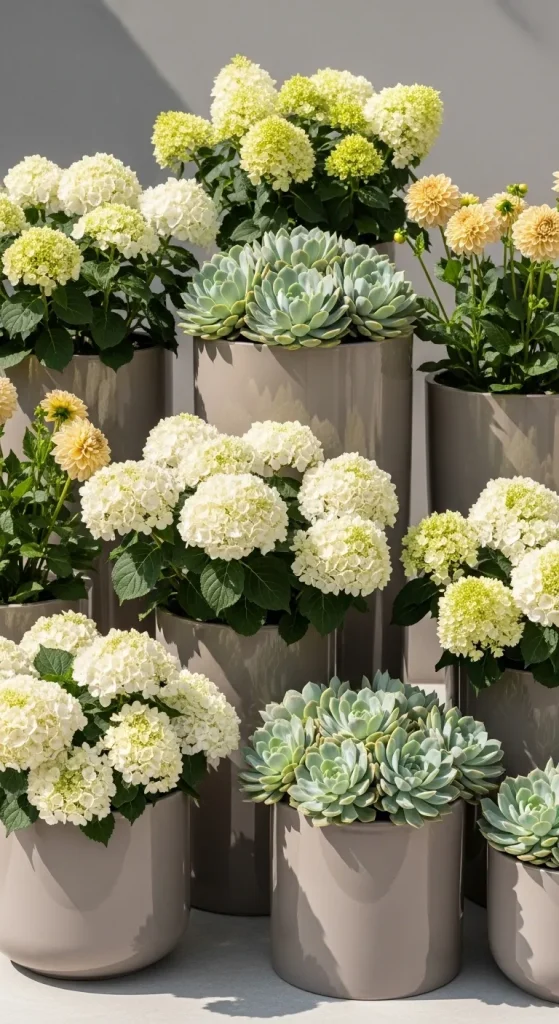 For a minimalist and calming garden, earthy neutral shades work beautifully. Cream, beige, soft greens, taupe, and ivory can create a natural, elegant feel. Flowers like white hydrangeas, beige dahlias, and soft green succulents add subtle beauty without overpowering the senses. This palette is ideal for modern gardens, small terraces, or spaces where you want the focus to be on texture and structure rather than bright colors. Neutrals can also be paired with bolder accent plants to create visual interest.