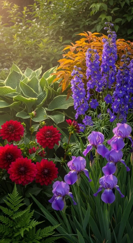 Deep, rich colors inspired by precious gems can make your garden feel luxurious and dramatic. Think ruby reds, sapphire blues, emerald greens, and amethyst purples. Flowers such as dark dahlias, blue delphiniums, and purple irises create a jewel-toned wonderland. This palette is perfect for larger gardens or spaces where you want to make a bold statement. Pairing jewel tones with metallic accents, like bronze planters or golden stakes, can elevate the opulence of the garden.
