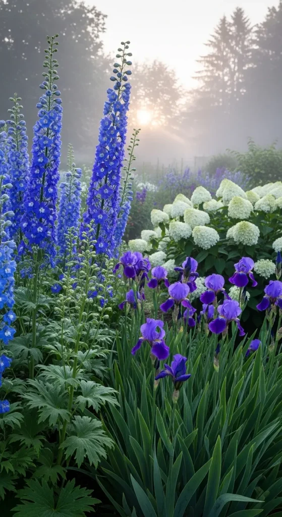 For a serene, calming effect, a cool palette with blues, purples, and soft whites is perfect. Blue delphiniums, purple irises, and white hydrangeas create a peaceful haven reminiscent of the ocean. This palette works beautifully near water features or patios, as it evokes tranquility and relaxation. Incorporating different textures, such as spiky flowers with soft blooms, adds depth while maintaining a harmonious color scheme.