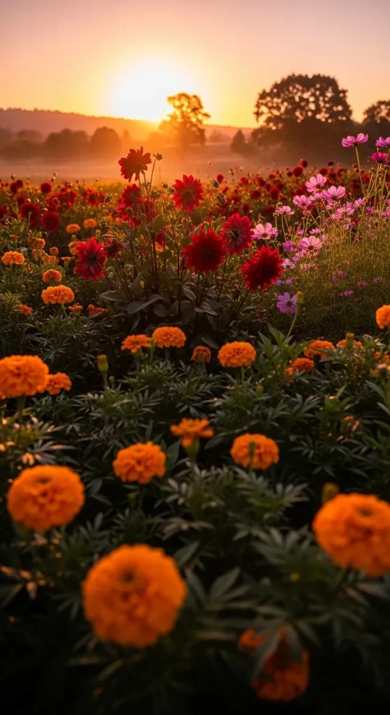 Inspired by the beautiful colors of the setting sun, this palette combines warm oranges, deep reds, soft pinks, and golden yellows. Flowers like marigolds, zinnias, dahlias, and cosmos can be paired to mimic the magic of a sunset. A sunset-inspired garden feels warm, inviting, and dramatic at the same time. It’s ideal for evening gatherings where the colors seem to glow under soft lighting, enhancing the garden’s natural beauty.