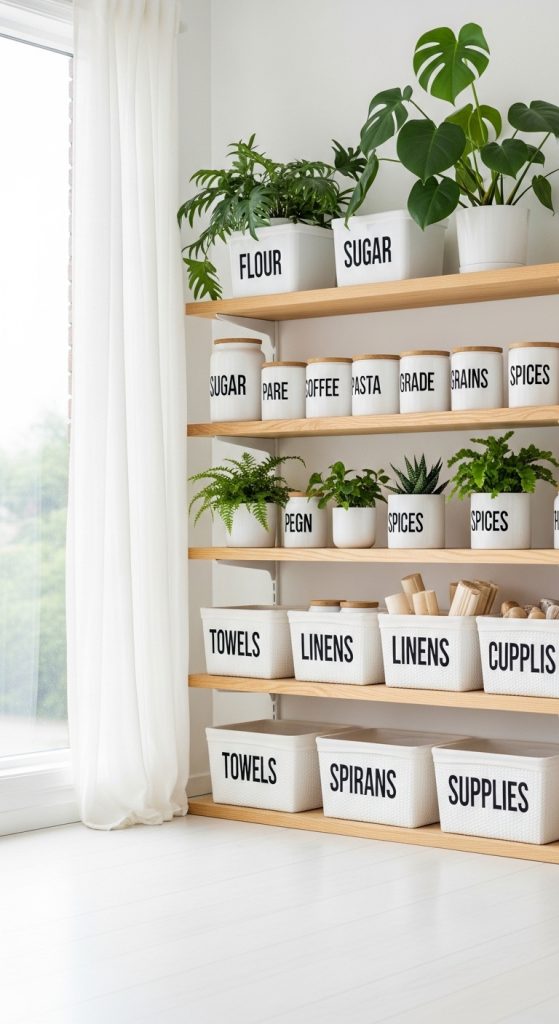 Labels transform chaos into calm. Use matching label designs across jars, bins, drawers, and baskets.