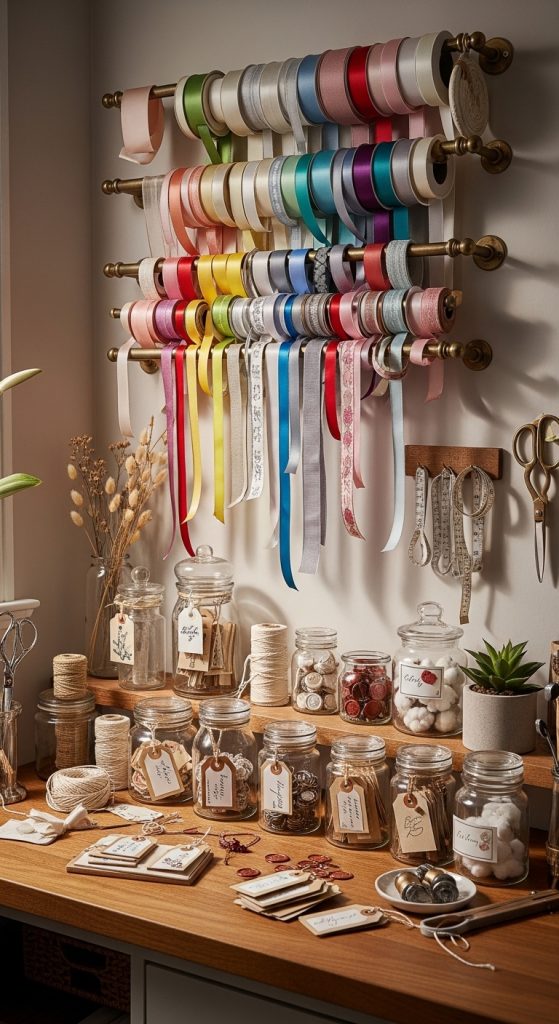 Ribbons, gift wrap, and twine can easily become a tangled mess. Create a dedicated wrapping station using wall-mounted rods to hold ribbon spools.