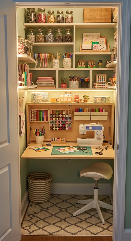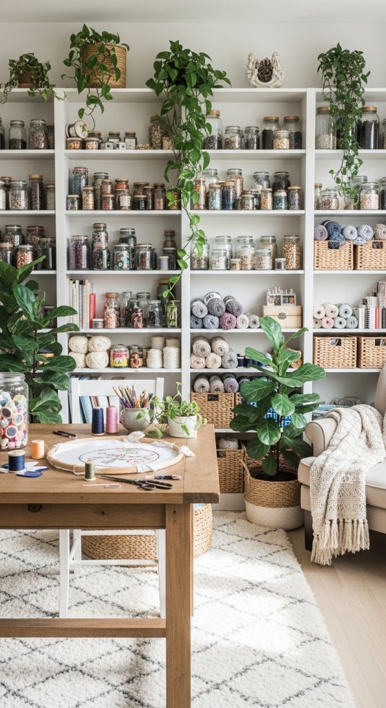 Open shelving is a game changer. Instead of hiding your supplies, turn them into décor. Install clean white or wooden floating shelves from floor to ceiling and arrange materials by color. Store yarn in woven baskets, display glass jars filled with buttons, and stack patterned paper neatly.