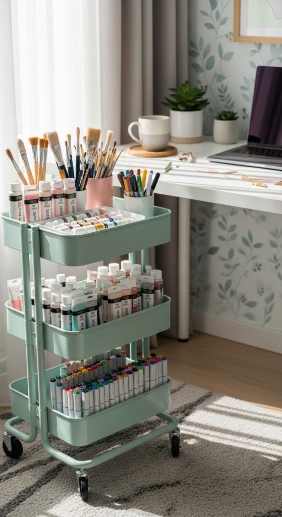 Choose a sleek metal or pastel-colored cart with three tiers. Organize by category — scissors and tools on top, paints and markers in the middle, paper or fabrics below.