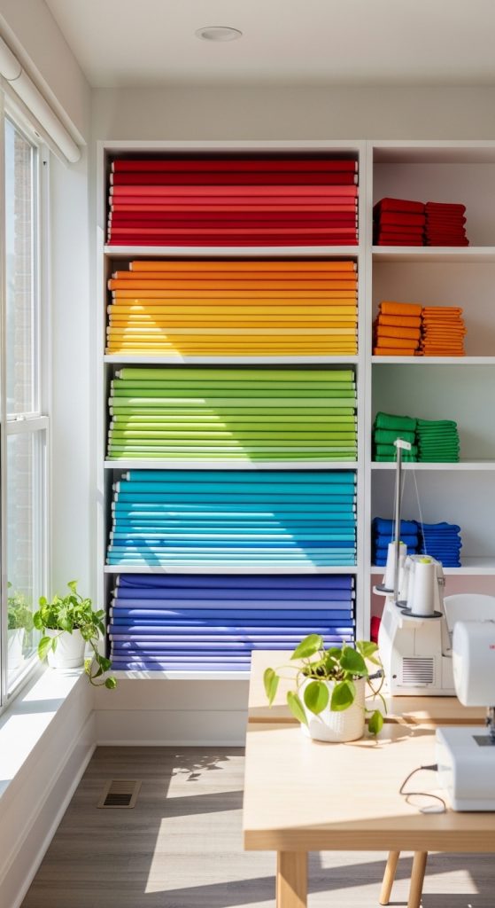 Use magazine holders, filing bins, or custom cubbies. Organize by color gradient for a rainbow effect — it looks breathtaking and makes selection effortless.