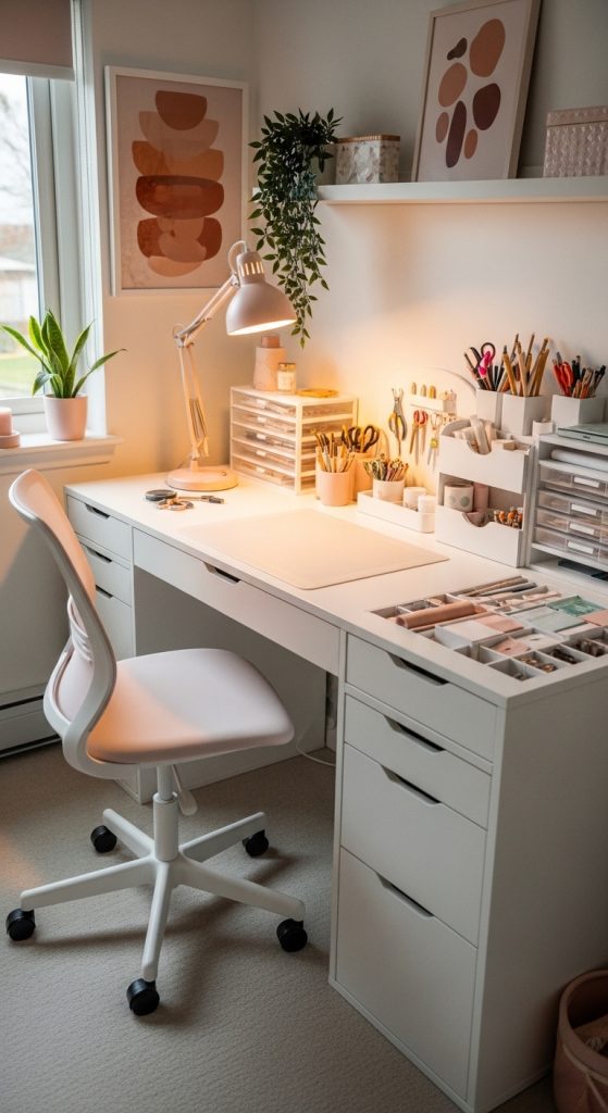 A custom built-in desk offers both workspace and hidden storage. Include drawers for tools, cabinets for larger machines, and open cubbies for decorative bins.