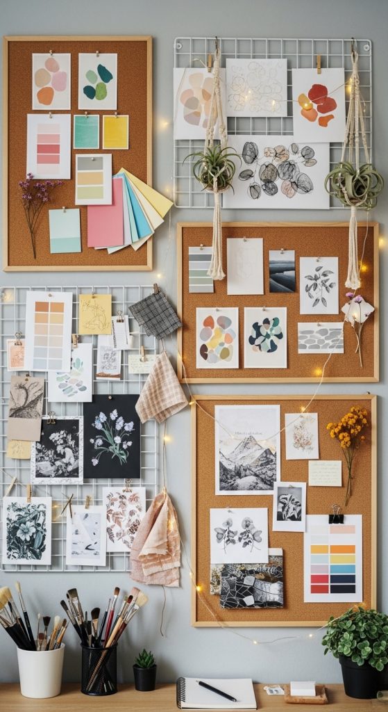 An organized inspiration wall keeps your creativity flowing without overwhelming the room.