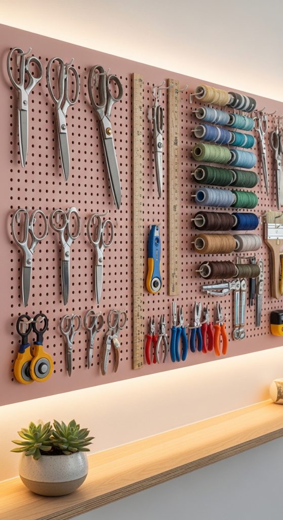 Hang scissors, rulers, washi tapes, thread spools, and measuring tapes. Paint the pegboard a soft blush, sage green, or classic white to match your theme.