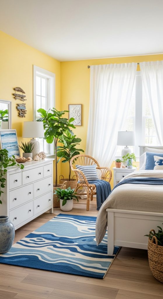 Yellow walls can evoke a sunny, beachy feel when paired with crisp white furniture and soft blue accents. Linen bedding, wicker chairs, and ocean-inspired decor bring a fresh, coastal look to the master bedroom. Add plants and light curtains for a breezy, relaxed ambiance reminiscent of a seaside escape.