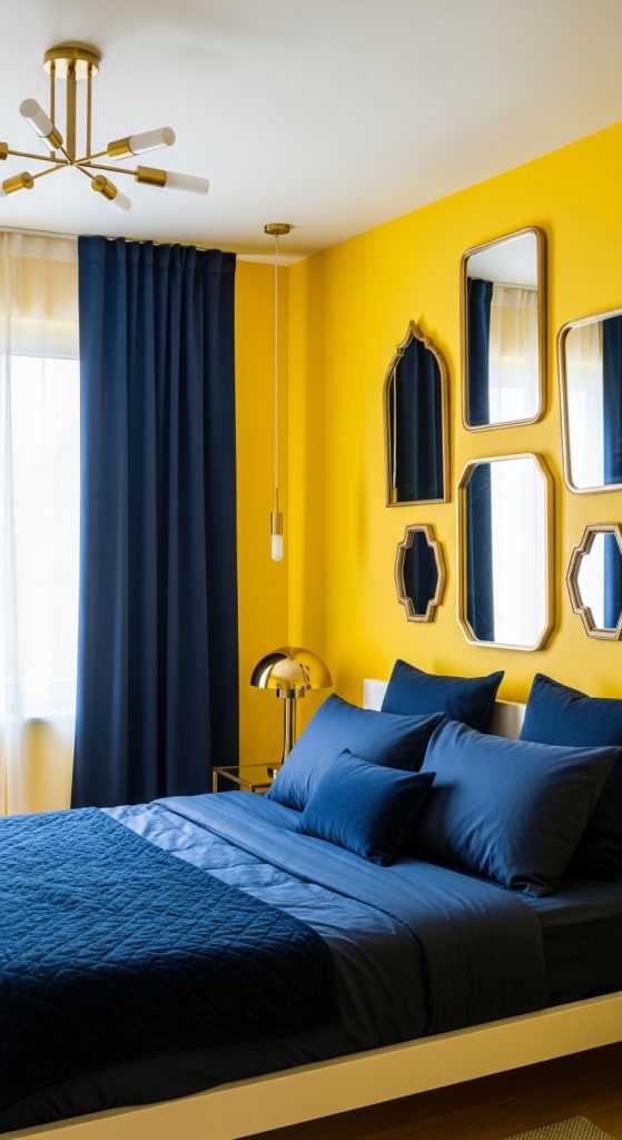For a bold statement, combine yellow walls with navy blue accents. Navy bedding, curtains, and furniture stand out beautifully against soft yellow walls. Incorporate brass lighting fixtures and decorative mirrors to enhance the room’s luxury feel. This color combination exudes confidence, style, and elegance.