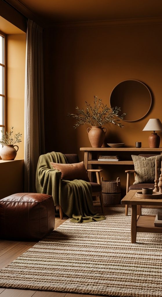 Deep mustard walls create a rich, warm atmosphere when paired with earthy tones like terracotta, olive green, or brown. Wooden furniture, woven rugs, and textured fabrics enhance the natural feel. This palette is perfect for creating a cozy, grounded space that is both inviting and luxurious.