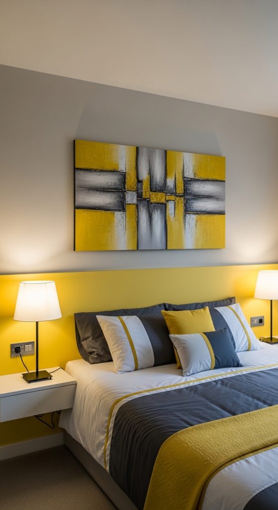 Yellow walls can be complemented beautifully with shades of gray. A plush gray upholstered headboard, matching nightstands, and gray drapes create a chic contrast against vibrant yellow walls. Add geometric throw pillows and a modern chandelier for a contemporary look that’s perfect for Pinterest inspiration.
