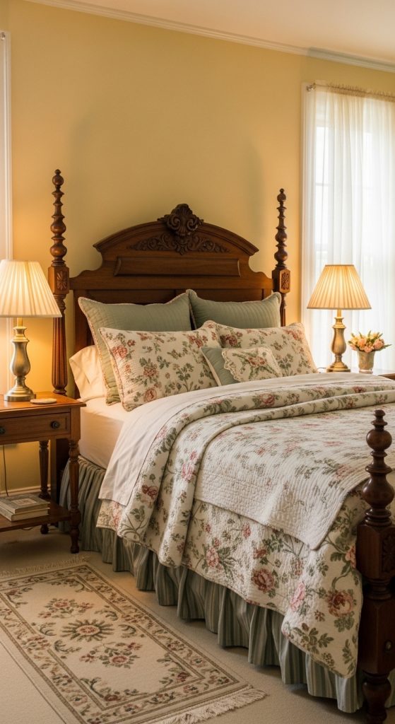 Create a nostalgic atmosphere by pairing sunny yellow walls with vintage furniture. A classic wooden bedframe, antique side tables, and floral textiles evoke a timeless charm. Use muted yellow tones and soft lighting to add warmth and comfort, perfect for cozy mornings and relaxing evenings.
