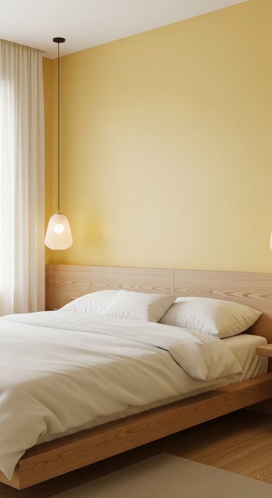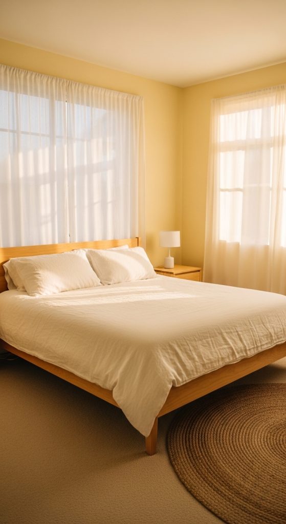 Create a bedroom that feels like a sunlit retreat. Pair soft pastel yellow walls with white linen bedding and light wood furniture. Add a jute rug and sheer curtains to keep the space airy. Minimalist decor with plants and subtle gold accents makes the room feel both warm and sophisticated.