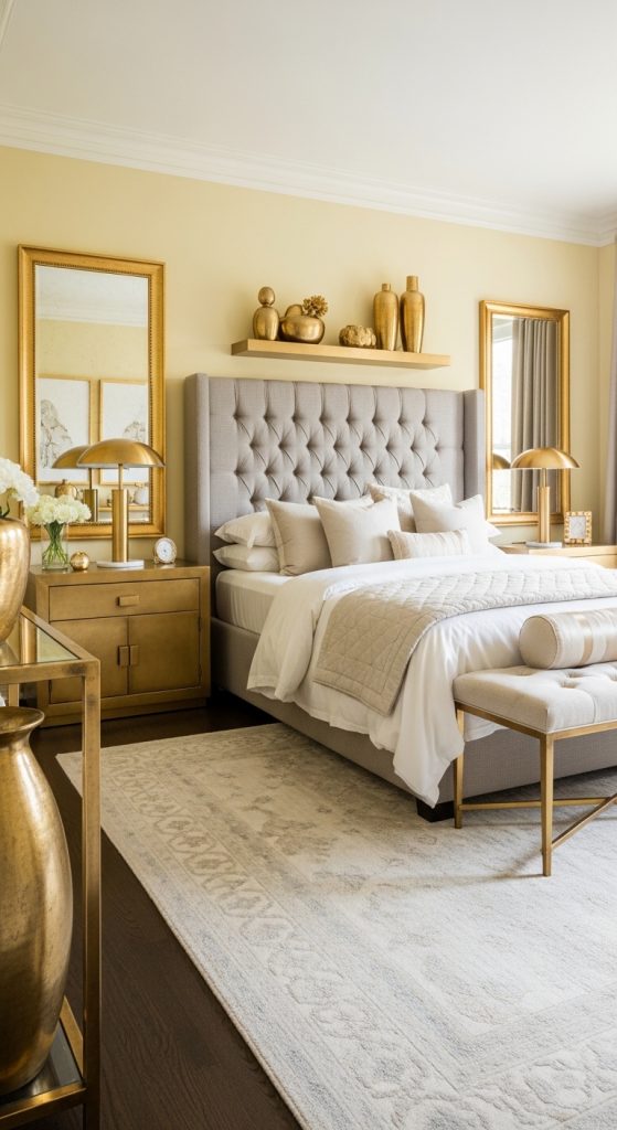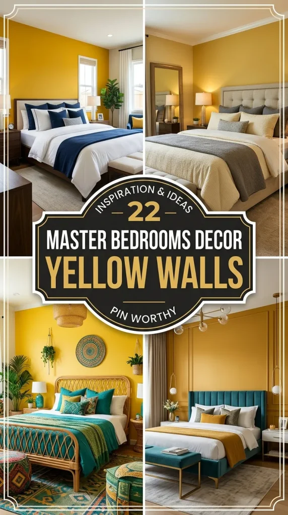 Yellow walls provide a perfect backdrop for metallic accents. Gold, brass, or copper light fixtures, mirrors, and decor pieces add a touch of glamour and sophistication. Pair with neutral furniture and soft fabrics to avoid overpowering the space. The result is a bright, stylish, and Pinterest-worthy master bedroom.